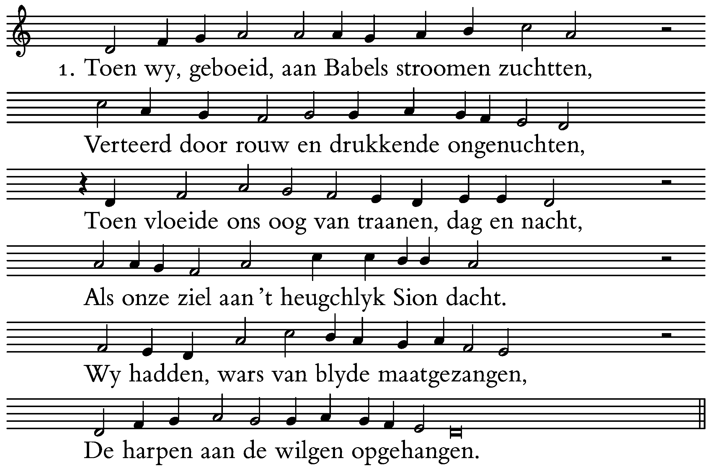 1. Toen wy, geboeid, aan Babels stroomen zuchtten,